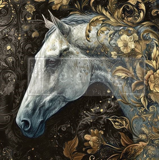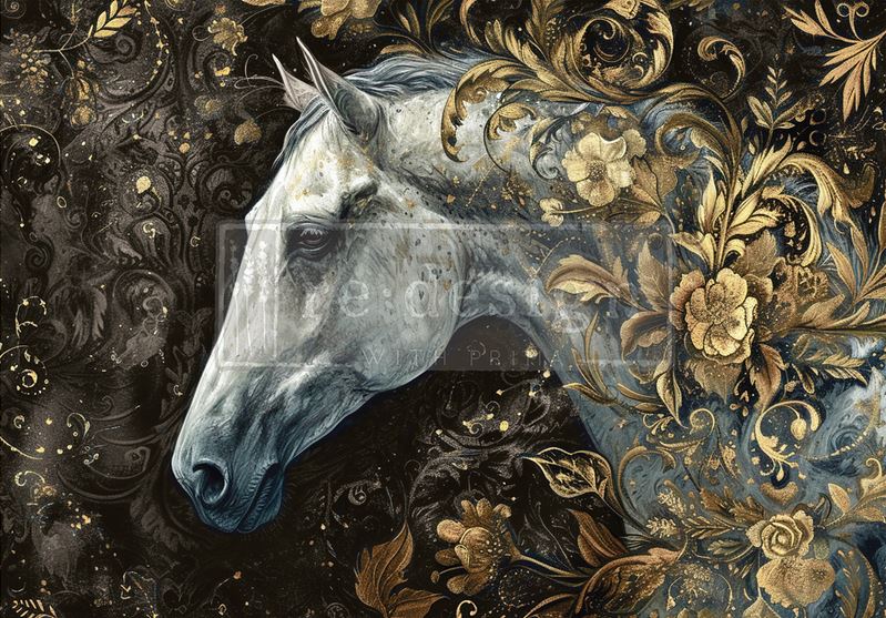 Unleash bold beauty with the Majestic Gallop Decor Transfer by Re·Design with Prima. This stunning design features a graceful white horse surrounded by intricate gold floral swirls, all set against a deep, moody background. Perfect for adding drama and elegance to furniture, walls, and creative projects, this transfer transforms ordinary surfaces into statement pieces. Ideal for lovers of fantasy, equestrian themes, or luxe vintage style. Easy to apply and unforgettable in impact.